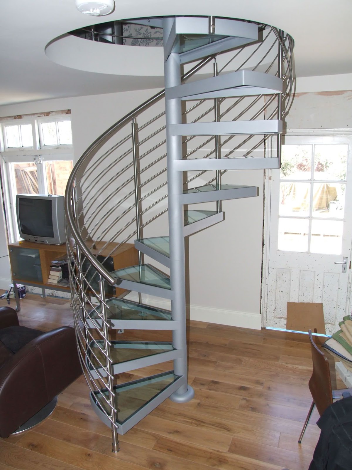 Tangga putar berbahan besi ini memiliki pijakan yang transparan.